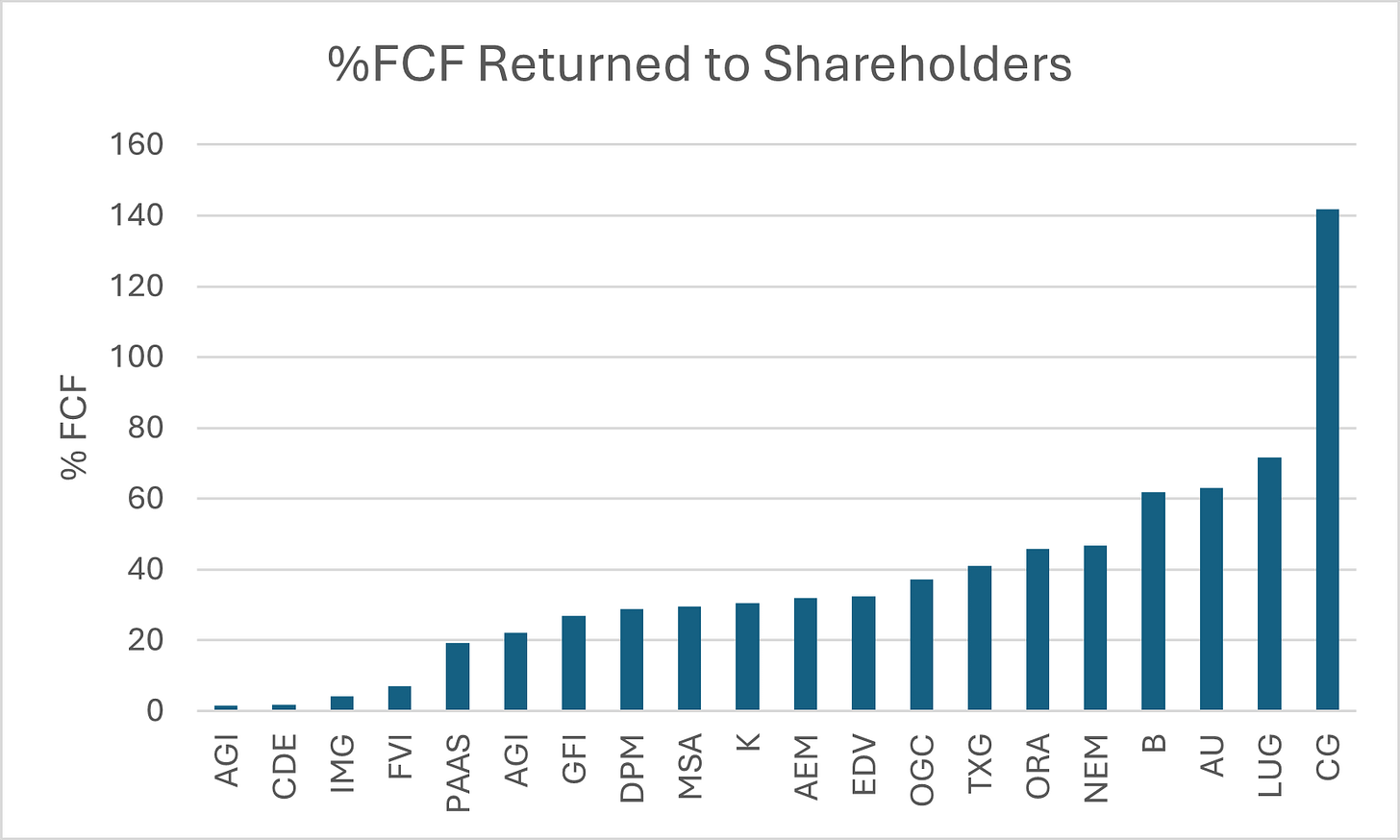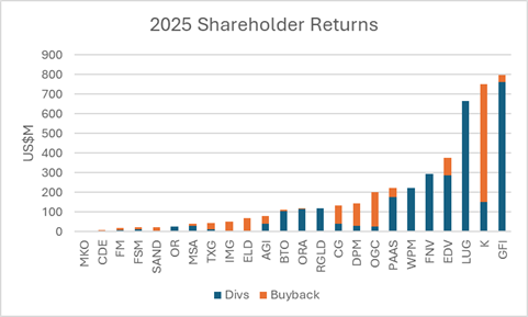Mining companies generated almost $32B in free cash flow (FCF) in 2025 and returned an average of 38% of FCF to shareholders, led by Lundin Gold at 72%, AngloGold Ashanti at 64%, and Barrick Mining at 62%. These figures do not include New Gold or Allied Gold, which were subject to takeovers and did not report full-year 2025 FCF figures.