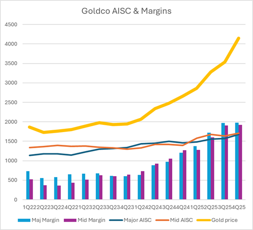 I ran a very crude analysis to see how resilient goldcos would be with this negative $1200/oz swing, using the full year and fourth quarter 2025 AISC, as a basis, assuming the current gold price of $4,500/oz holds for the rest of the year, which is about $1000/oz higher than the average price for 2025. This showed a handful of companies with sub-30 % AISC margins, but generally, companies would maintain a gold level of profitability. However, looking at what further deflation of the gold price could mean, by running the higher AISC numbers at the 2025 average gold price, the wheat starts to separate from the chaff.