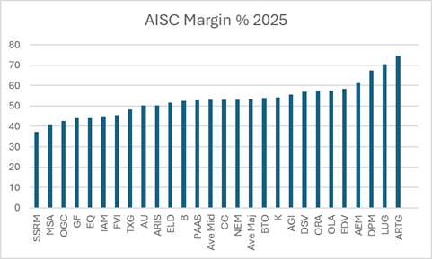 Among the intermediates, the average AISC increased by 19% to $1648/oz, but the average AISC margin rose from 42% in 2024 to 53% in 2025. Leading the pack was Artemis Gold at $869/oz and Lundin Gold at $1015/oz. Bringing up the rear were SSR Mining ($2153/oz) Allied Gold ($2057/oz) and Mineros ($2032/oz). This data includes estimates and assumptions for New Gold, which was acquired by Coeur Mining and did not report full-year 2025 figures.