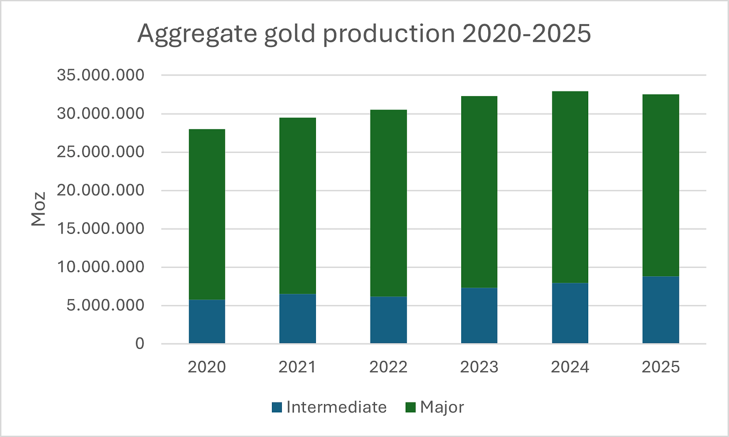 Gold production continued to track sideways in 2025, with output from the major producers dipping by 5% to an aggregate 23.7Moz of gold equivalent compared with 25Moz in 2025. This fall reflects the divestment of assets from Newmont and Barrick Mining, as seen in the 10% increase in production by the intermediate companies to 8.8Moz from 7.7Moz in 2024.