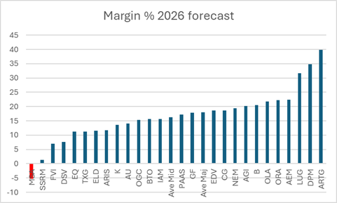 If the gold price averages the same as it did in 2025, $3440/oz, we see a very different picture with four companies with a single-digit AISC margin and one, Mineros, having a negative margin. Another $1,000/oz fall in gold would be very problematic for the gold sector and would definitely impact what we will discuss in the next section.